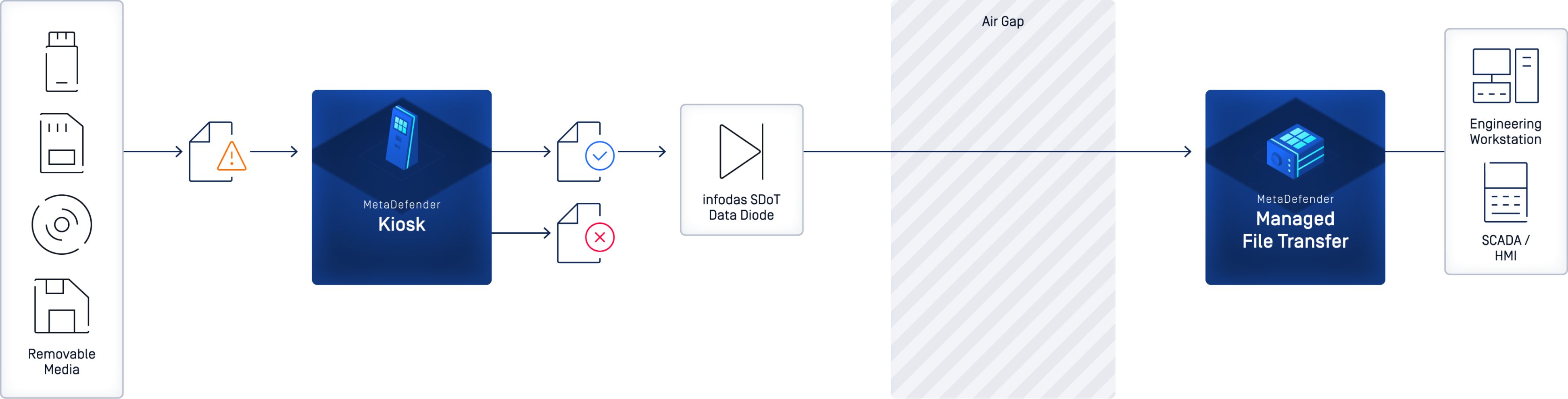 Die unidirektionale SDoT-Diode oder der bidirektionale High-Assurance-Guard SDoT Security Gateway sorgen jederzeit für eine logische Domänentrennung und können kombiniert werden mit Metadefender und Kiosk kombiniert werden, um sicherzustellen, dass keine Malware in sensible Netzwerke gelangt. Schließlich wird durch die Kombination von Metadefender mit 35+ oder mehr Anti-Malware-Engines, SDoT Security Gateway und PATCH.works ein automatisches Patch-Management für isolierte Netzwerke ermöglicht.